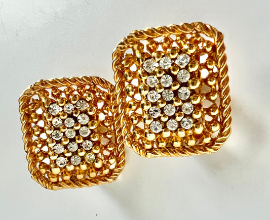 Vintage 1990s Gold Square Basketweave Rhinestone Clip Earrings