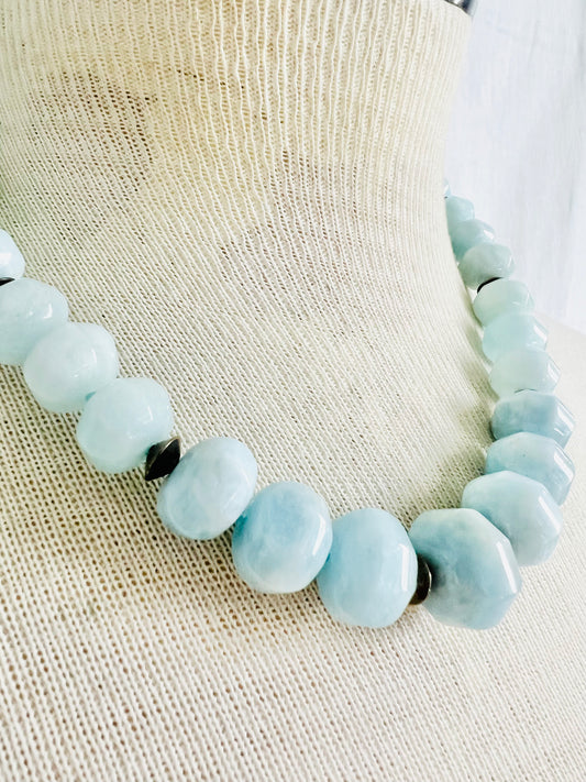 Hand Knotted Faceted Large Aquamarine Stone Necklace with Sterling Clasp