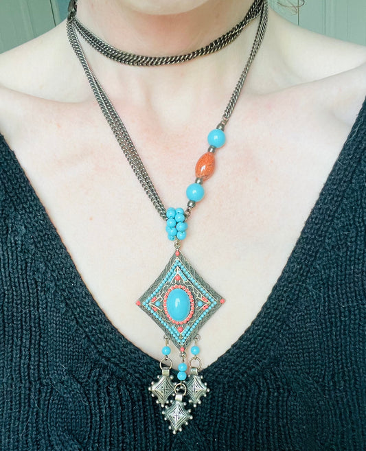 Vintage 1970s Signed Hobe Faux Turquoise and Coral Necklace