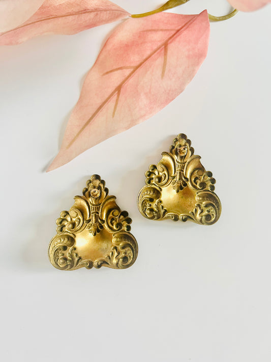Vintage Ornate Brass Triangle Victorian Revival Style Earrings