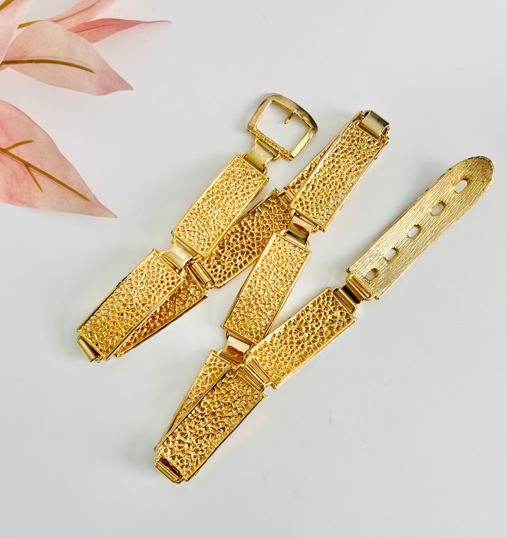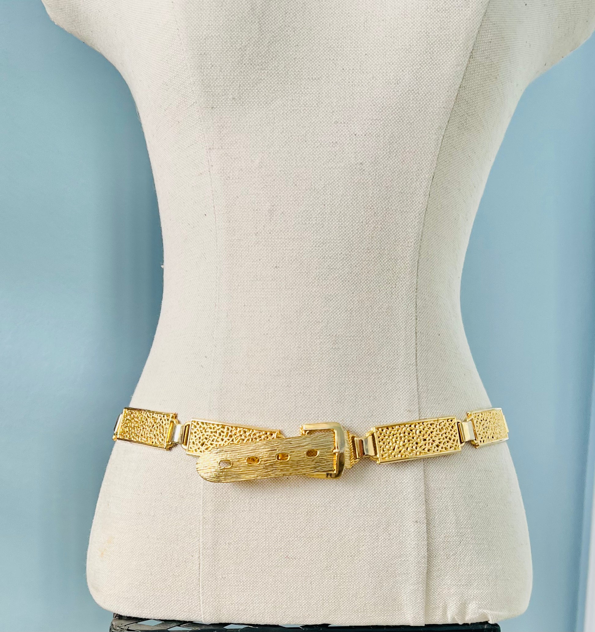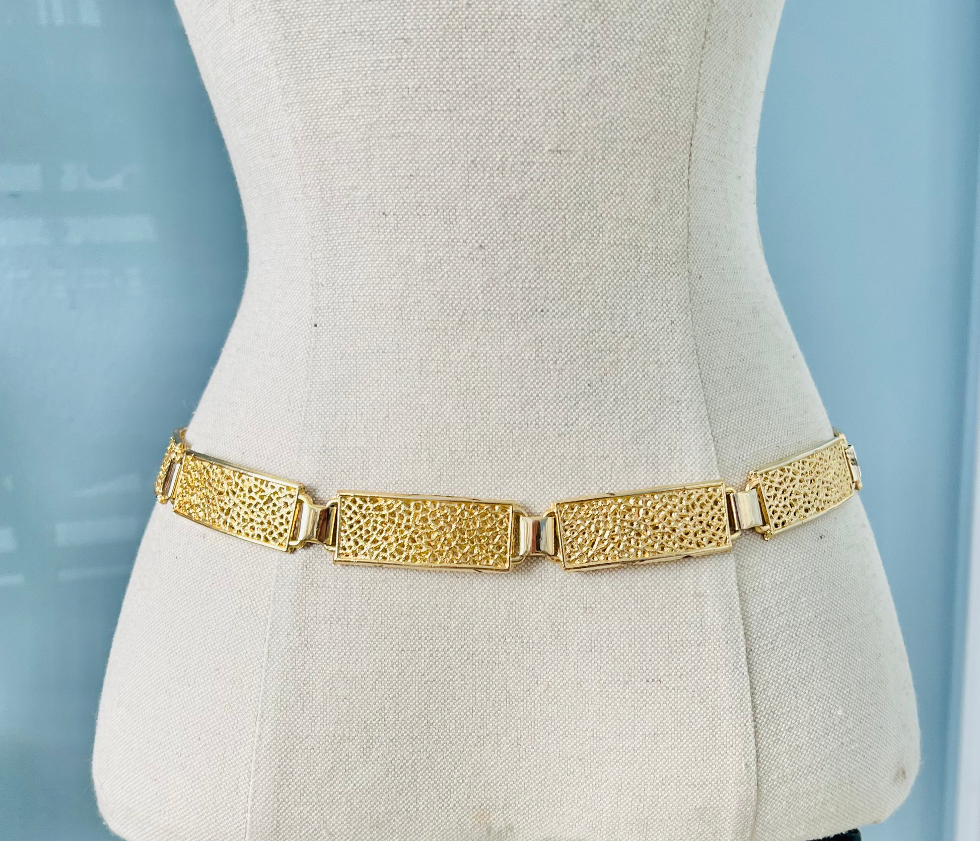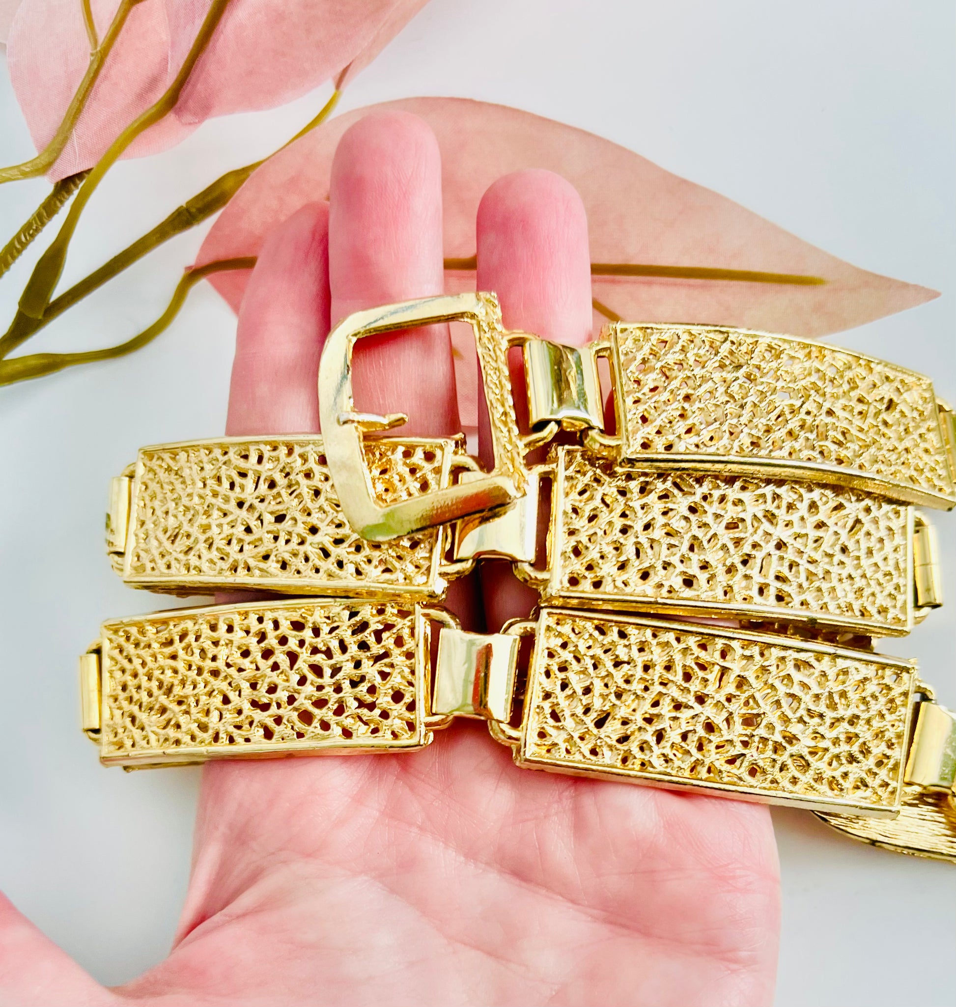 This is a beautiful and well crafted belt that will go with everything in your closet. Ten filigree panels are linked together to create this piece. It is adjustable in length from 28 to 31 inches by moving the buckle in different slots. Great condition and ready fro you to style in your own unique way.