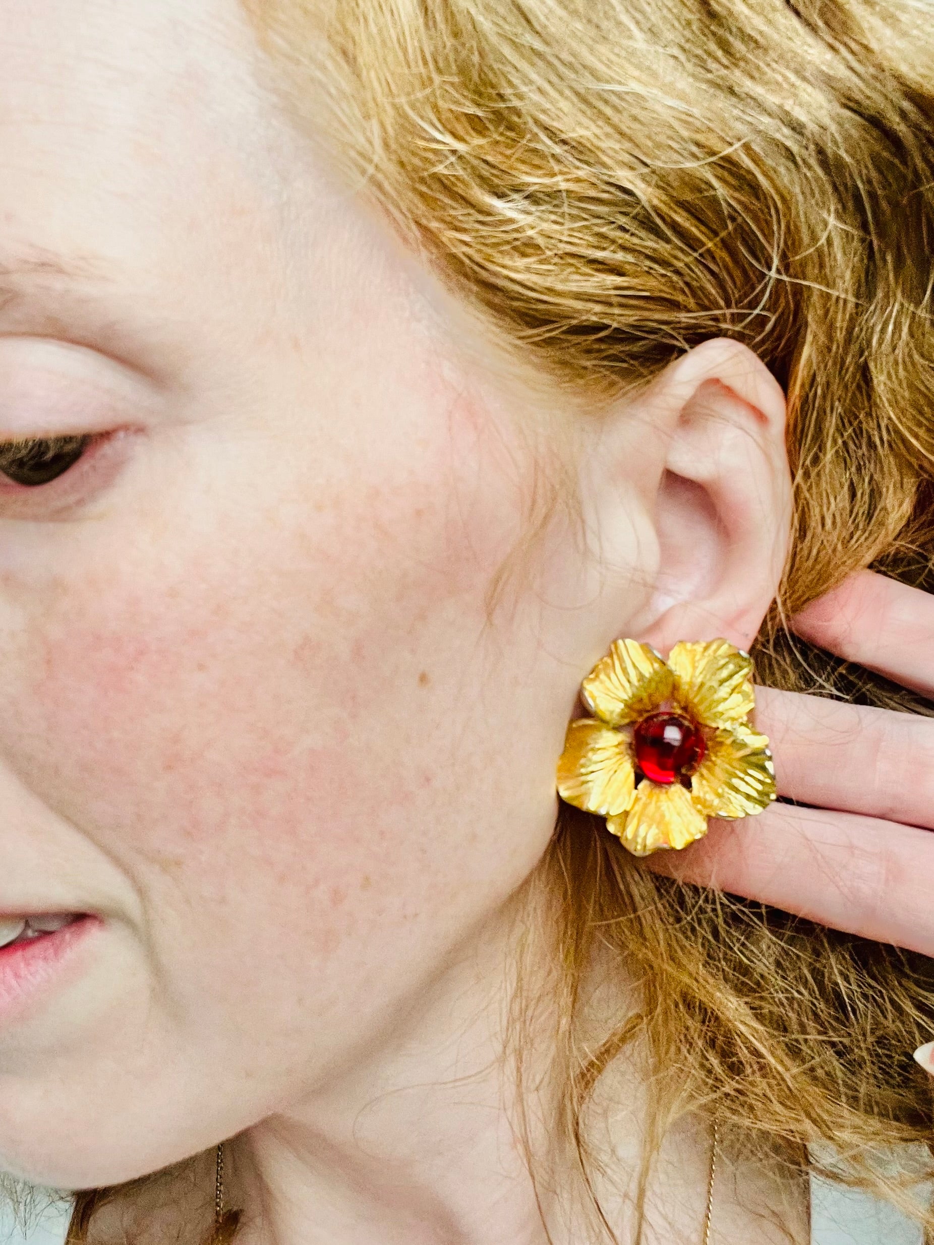 Vintage MidCentury Red Glass Gold Flower Earrings