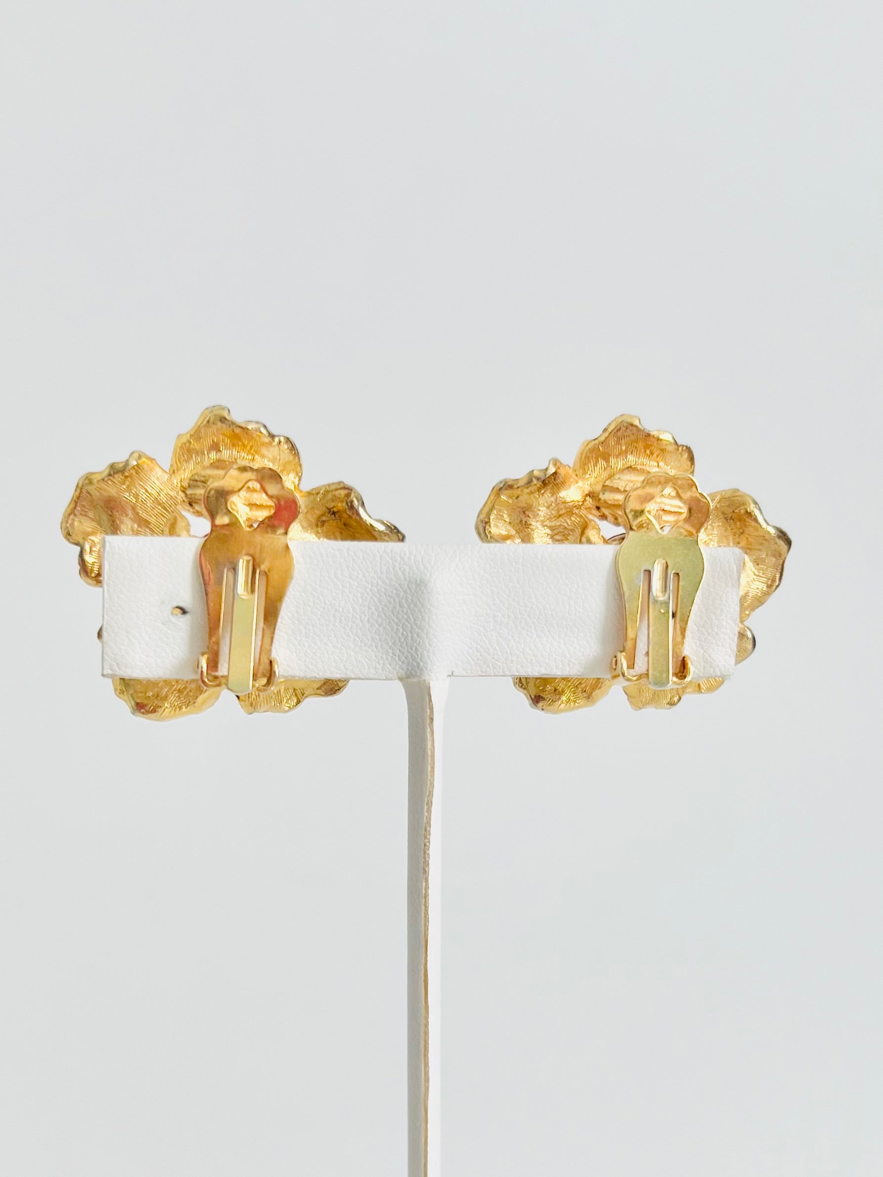 Beautiful pop of red right in the center of these gold tone midcentury earrings. These earrings are extremely comfortable on the ear. They are not heavy but do have some slight weight. There backs have a little wear but no one will see that when you are wearing them.